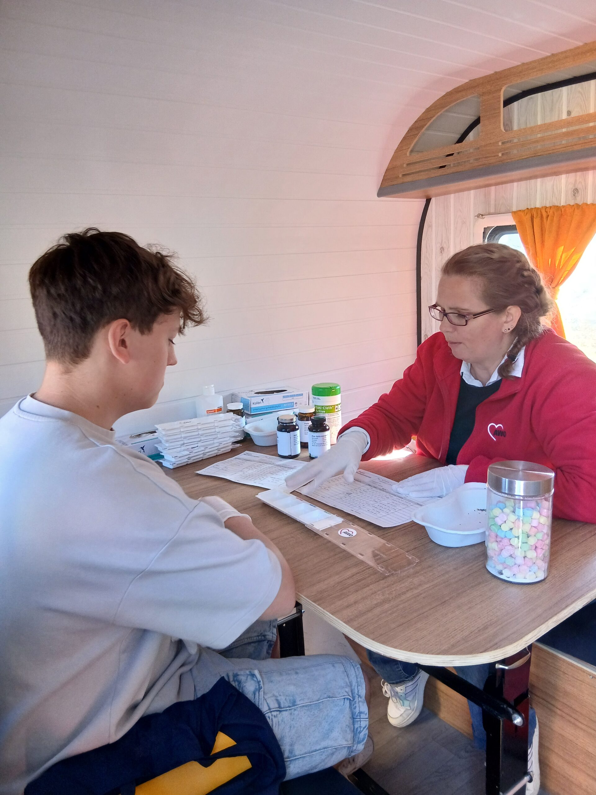 Das Highlight: unser Pflegeberatungsmobil! Dort bot man den Interessenten die Möglichkeit, erste pflegefachliche Kompetenzen zu erlernen! Gemeinsam und unter Anleitung konnten Interessierte dort „Medikamente“ richten. Keine Sorge… natürlich keine „echten“ Medikamente! Statt Ramirpil und Valsartan stand heute Haribo Grün und Rot auf den extra dafür angefertigten Medikationsplänen.