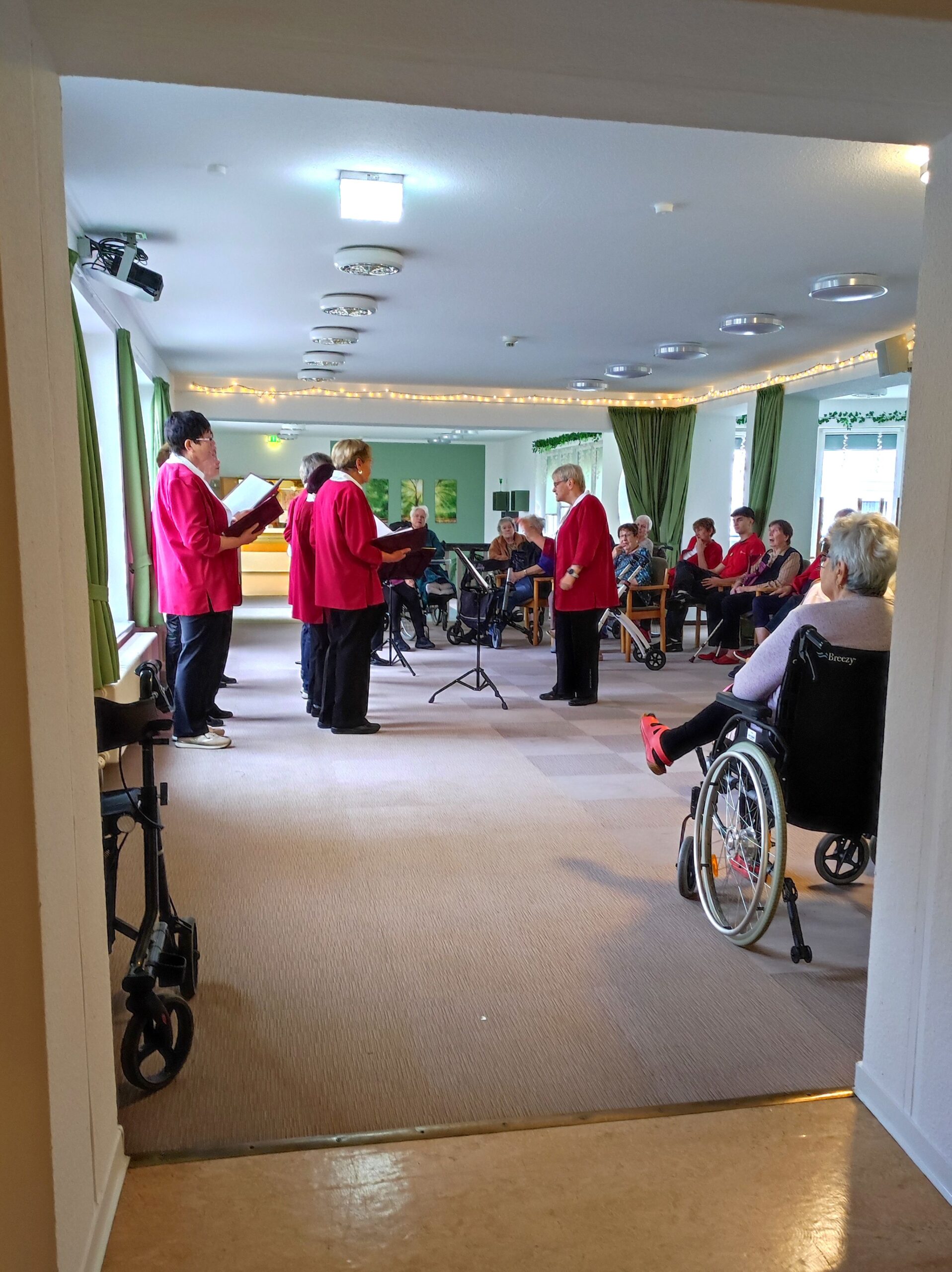 Der erste Auftritt erfolgte im Grünen Salon, wo die Sängerinnen und Sänger ein liebevoll zusammengestelltes Programm präsentierten. Anschließend setzte der Chor seine Vorführungen im Foyer fort, sodass weitere Bewohnerinnen, Bewohner und Gäste der Tagespflege die Gelegenheit hatten, den musikalischen Moment mitzuerleben.