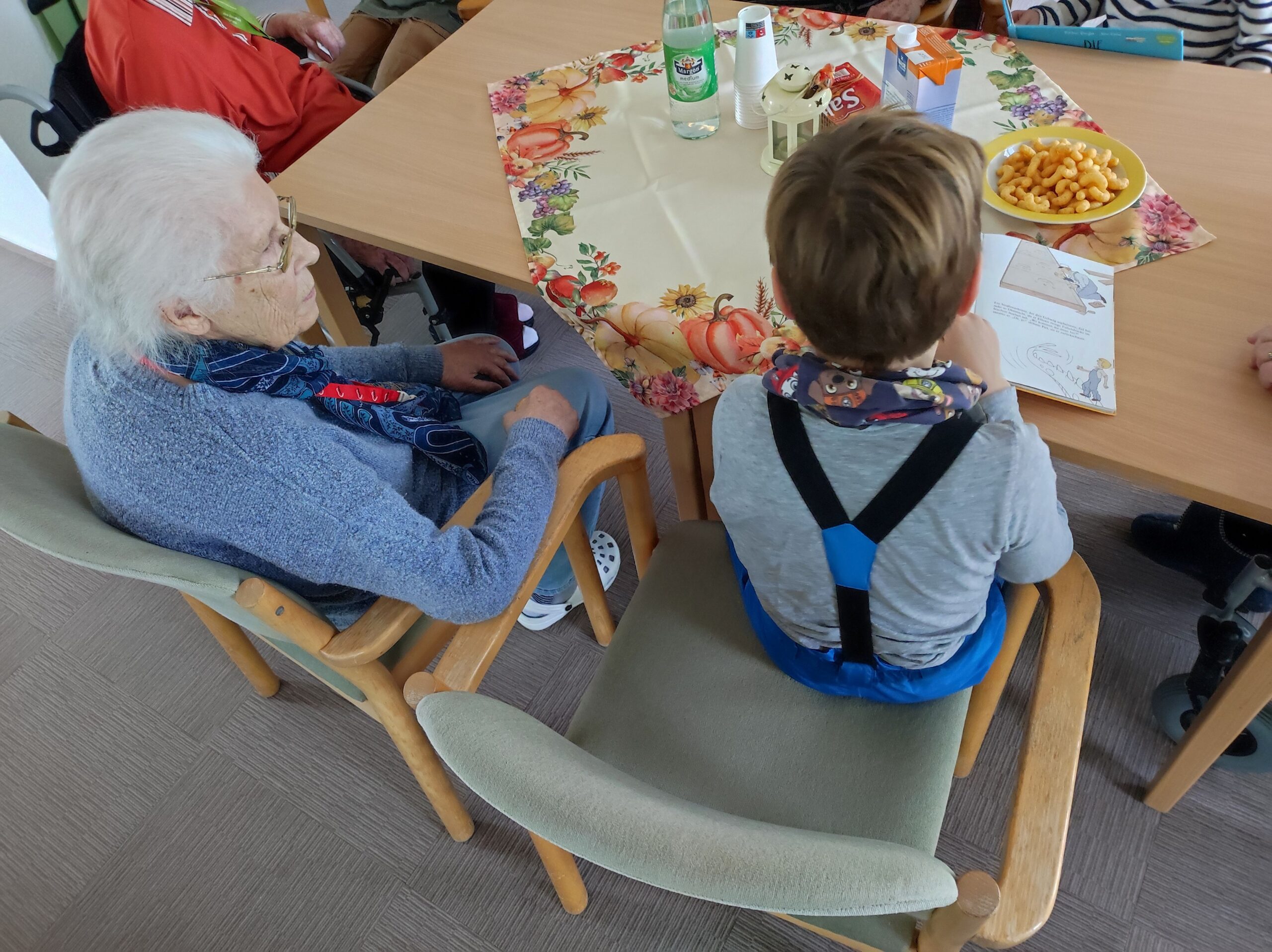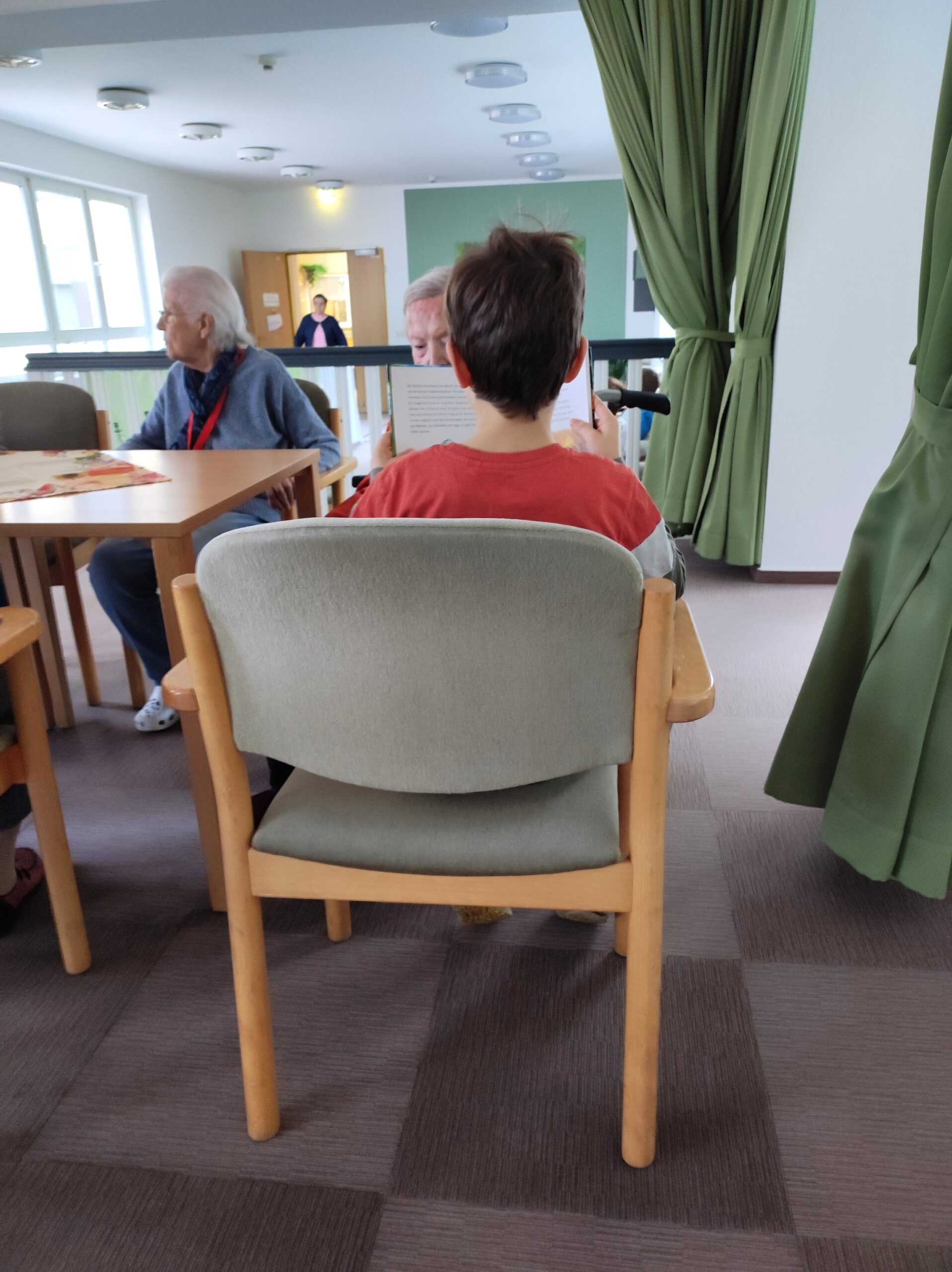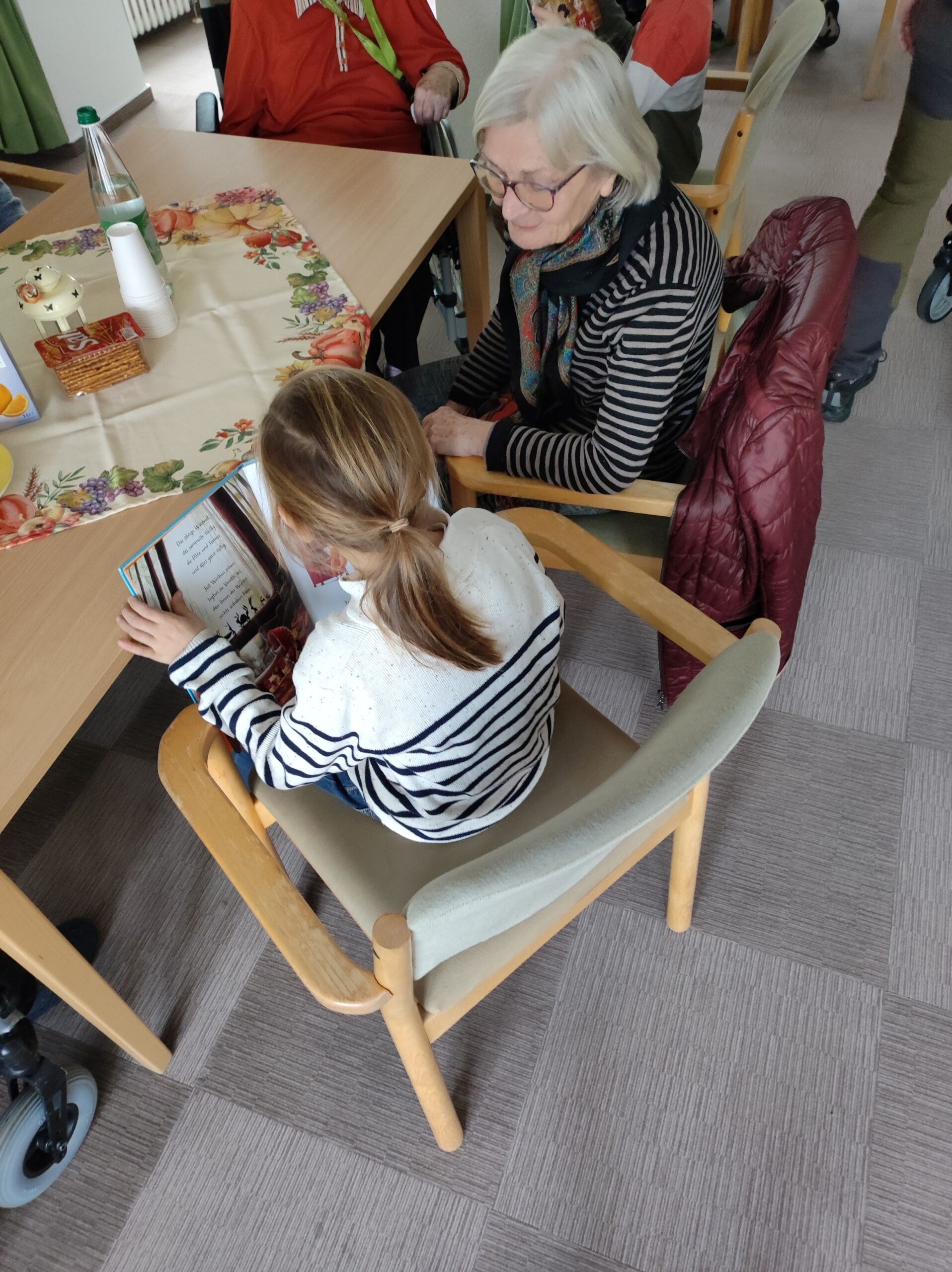 Währenddessen hatte der andere Teil der Klasse Bücher mitgebracht und las im Grünen Salon den Seniorinnen und Senioren ihre Lieblingspassagen daraus vor. Die Bewohnerinnen und Bewohner lauschten aufmerksam – und einige ließen es sich nicht nehmen, selbst etwas vorzulesen. Diese Begegnungen zwischen Jung und Alt sorgten für eine warmherzige und sehr persönliche Atmosphäre.