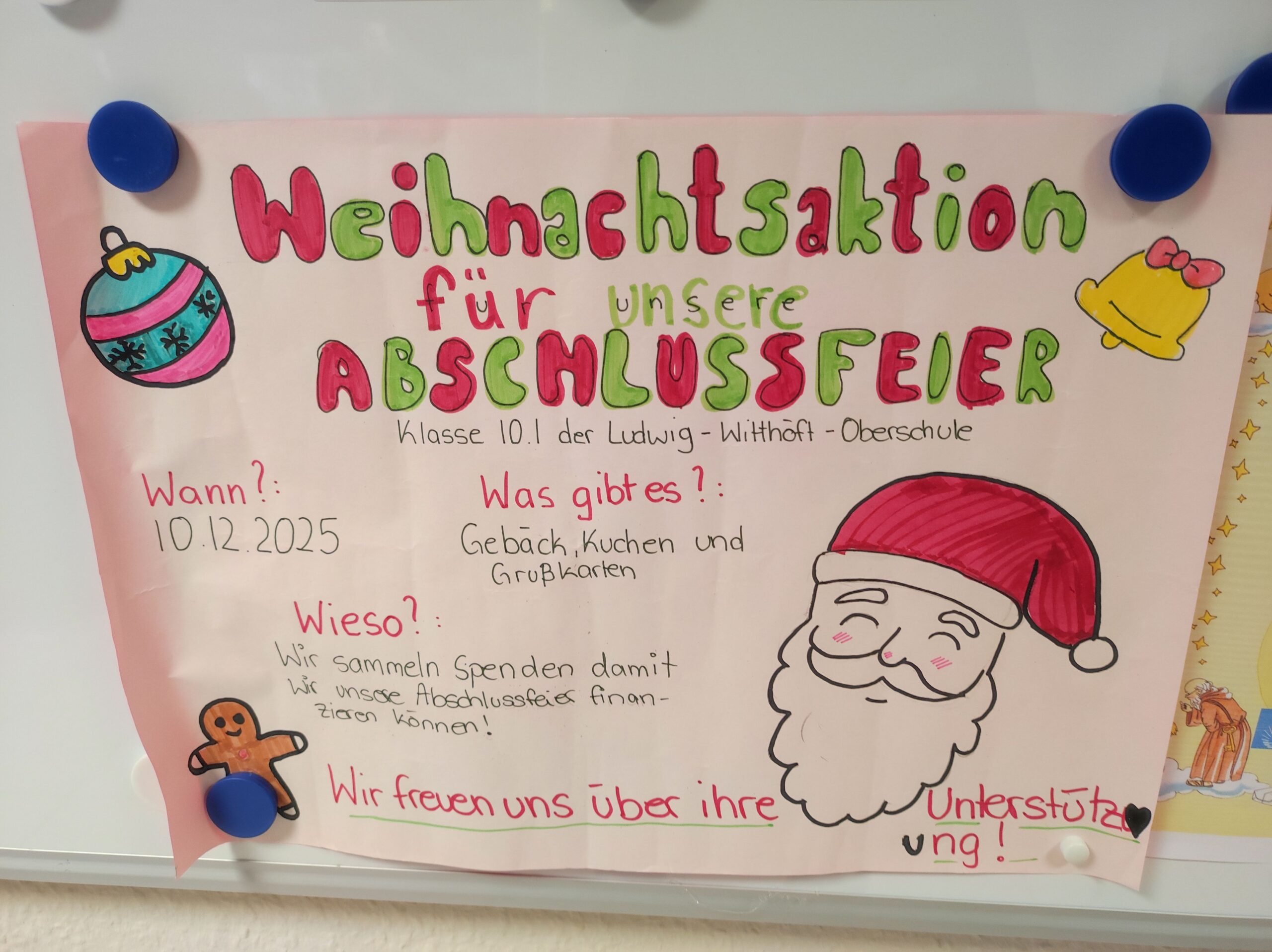 Am 10. Dezember 2025 veranstalteten Schülerinnen und Schüler der 10. Klasse der Ludwig-Witthöft-Oberschule aus Wildau einen Kuchenbasar im Foyer unserer AWO-Einrichtung Wildau. Die Klasse hatte sich mit viel Kreativität auf diesen Tag vorbereitet, um Besucher/innen, Bewohner/innen, Gästen und Mitarbeitenden in vorweihnachtliche Stimmung zu versetzen und gleichzeitig einen guten Zweck zu unterstützen.